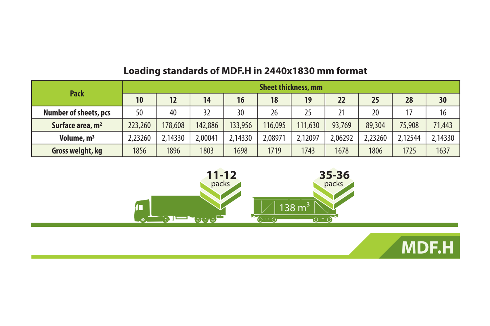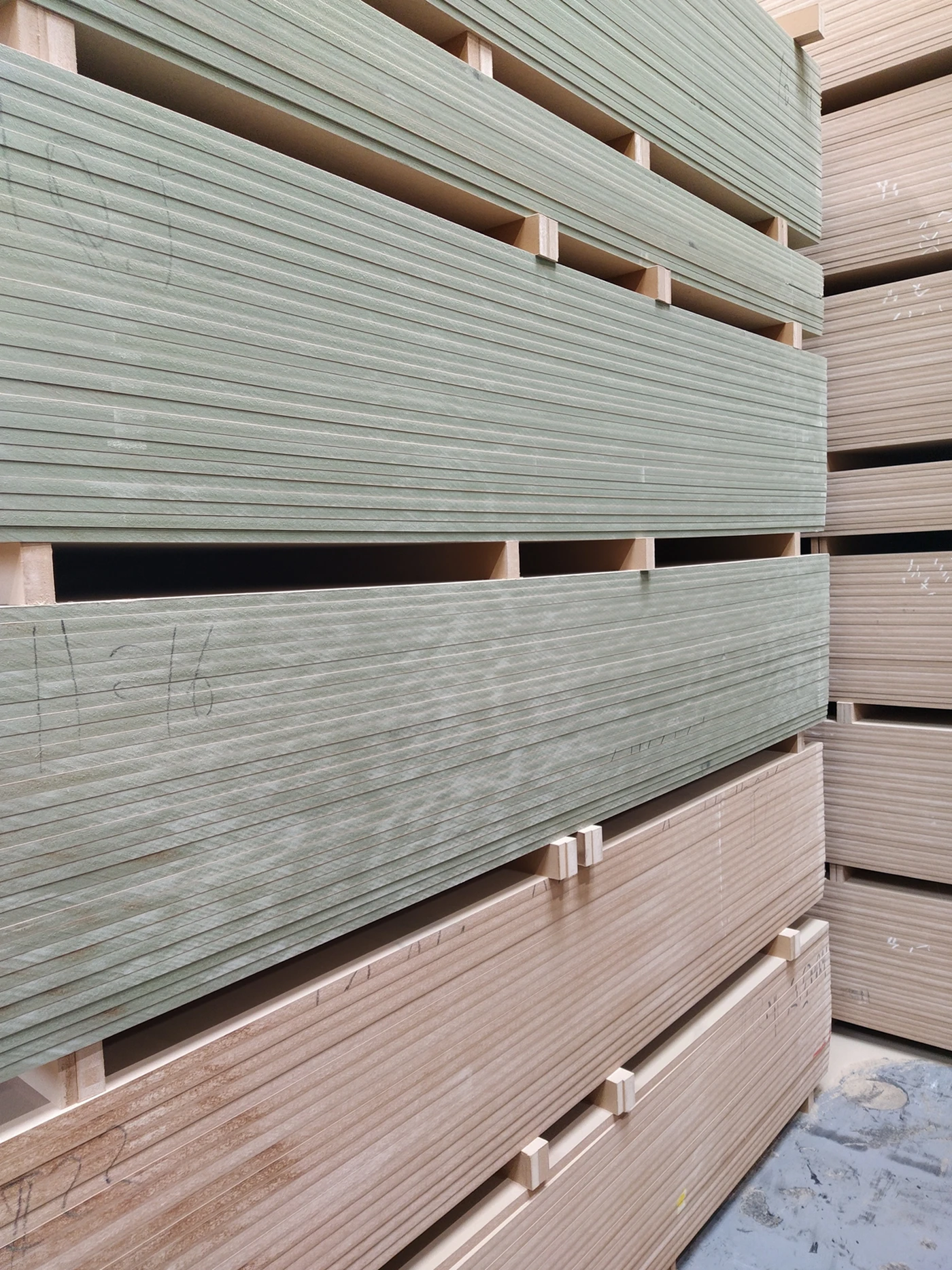 MDF.H (moisture-resistant MDF), unlike the standard MDF, has a denser structure. Therefore, the board is not subjected to swelling, and its surface is not destroyed by condensation. The boards obtained in this way are used in wet rooms, exclusively inside the building, and withstand accidental contact with water. MDF.H board can be distinguished from the standard by its green color.